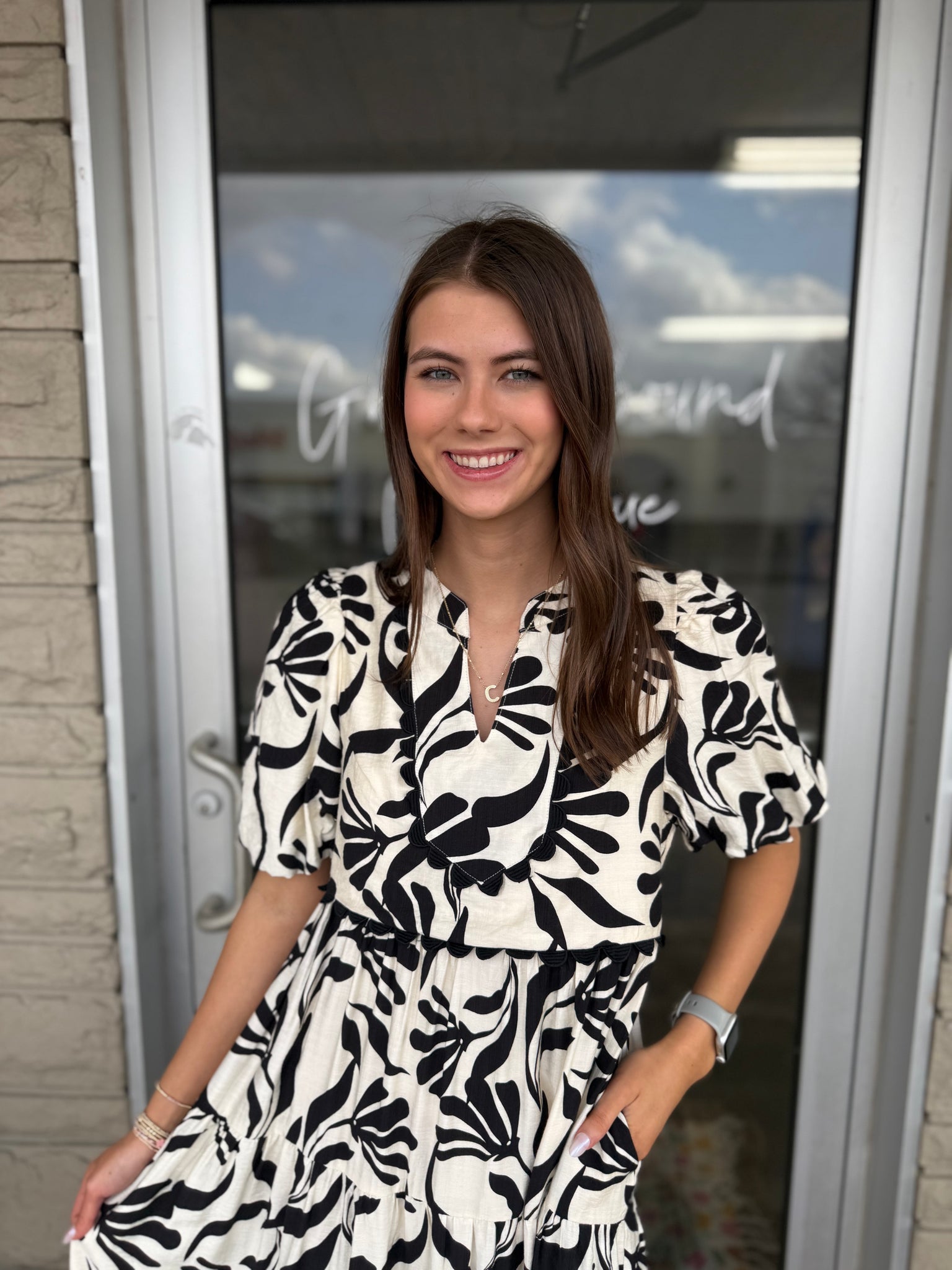 Step into playful elegance with this tiered midi dress featuring charming short puff sleeves and delightful scalloped details. Its layered silhouette adds movement and fun, making it perfect for days full of laughter and light-hearted moments. Whether for brunch or a casual outing, this dress brings a whimsical flair to your wardrobe with every twirl. Claire is wearing a small.