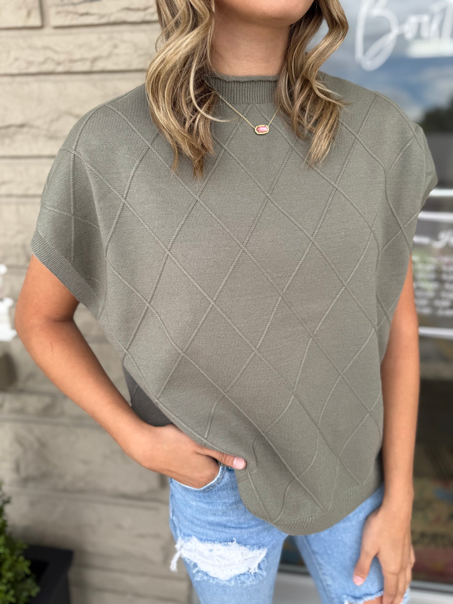 This olive green sweater vest features a relaxed drop shoulder design for effortless layering. Crafted from super soft fabric, it offers exceptional comfort throughout the day. Unique detailing adds subtle interest, making it a versatile piece for transitional autumn wardrobes. True to size, Anna Claire is wearing a small.