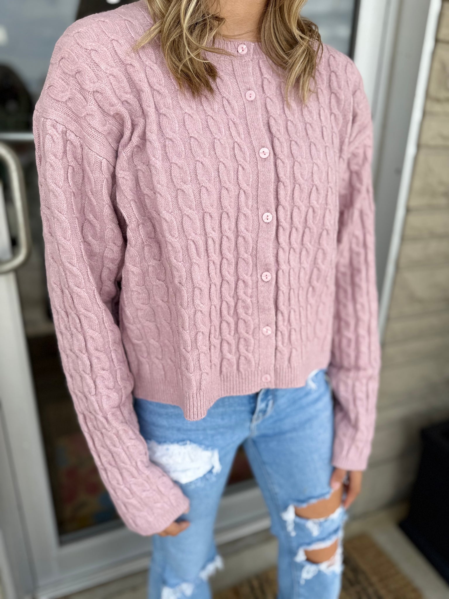 This dusty rose cable knit cardigan features a classic button-up design, ideal for layering across all seasons. Its textured knit offers warmth without bulk, making it a versatile addition to your wardrobe for year-round wear. The soft color and timeless style ensure effortless pairing with any outfit. True to size, Anna Claire is wearing a small.