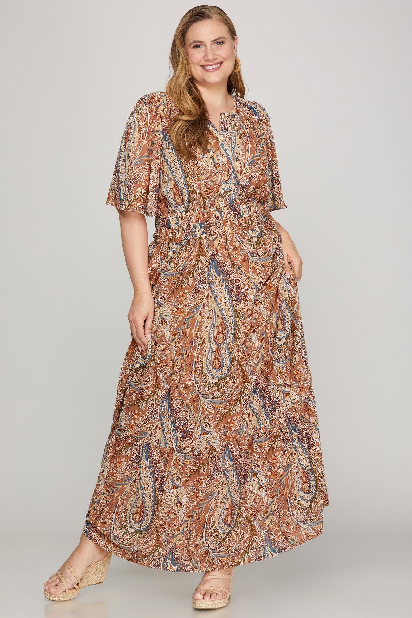 The Cinnamon Maxi dress combines elegant design with practical features. It features delicate half flutter sleeves and a tiered maxi silhouette that offers graceful movement. Fully lined for comfort and coverage, this dress includes convenient pockets and a buttoned neckline designed for easy nursing access. Ideal for both everyday wear and special occasions, it seamlessly blends style with functionality.