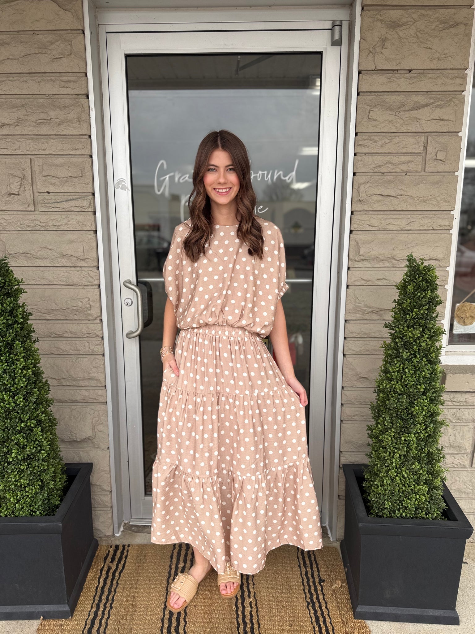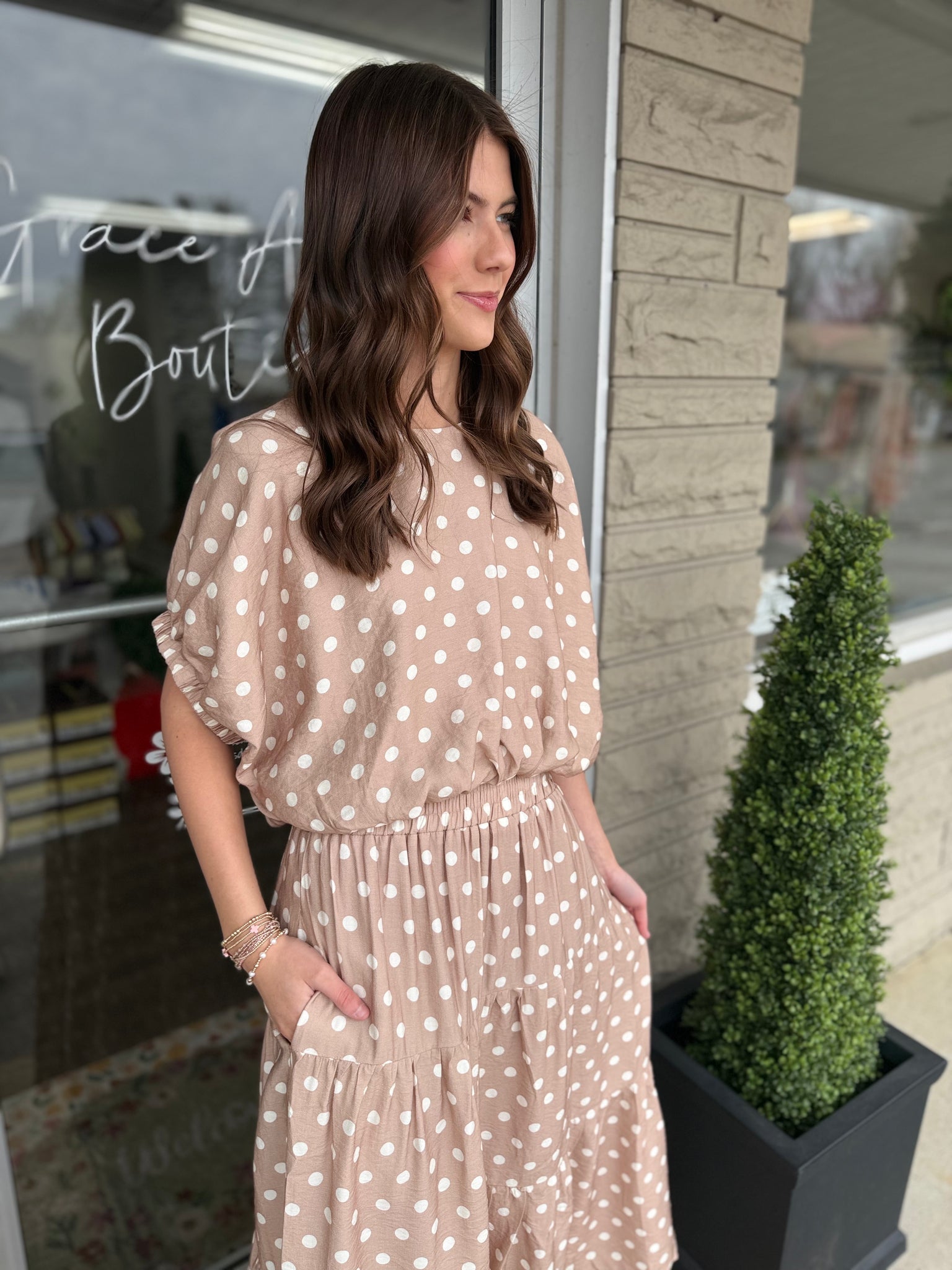 -Sand color top with white polka dots.