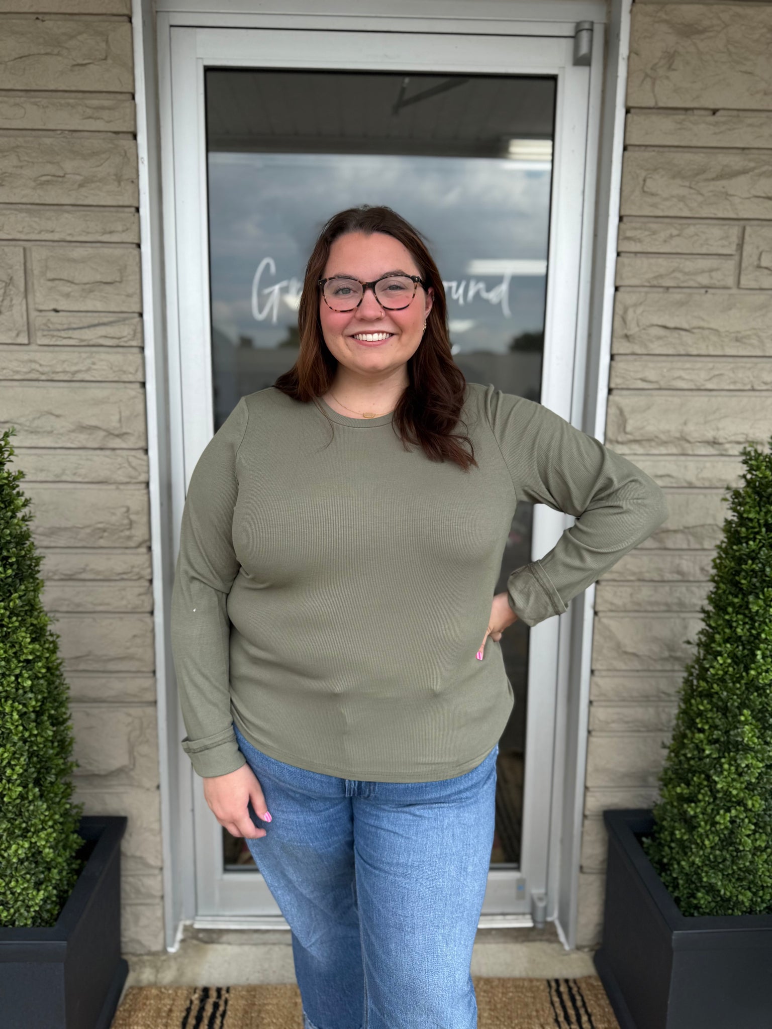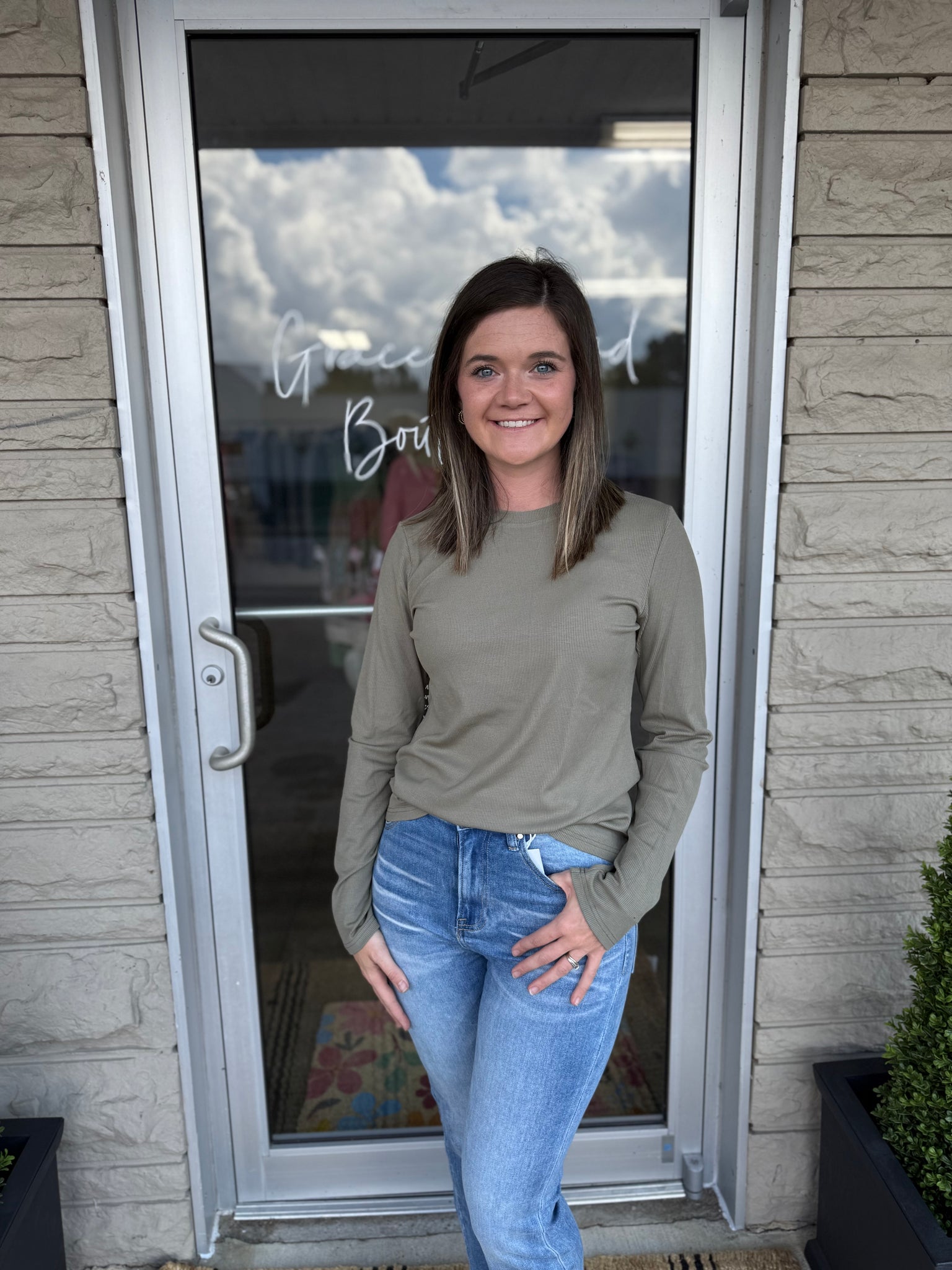 This long sleeve tee in a rich fall green shade features a high neck design, offering both warmth and a refined silhouette. Crafted for cooler seasons, it combines comfort with a sophisticated look, making it an essential layering piece for your autumn wardrobe. Form fitted, Laura is wearing a 2XL!