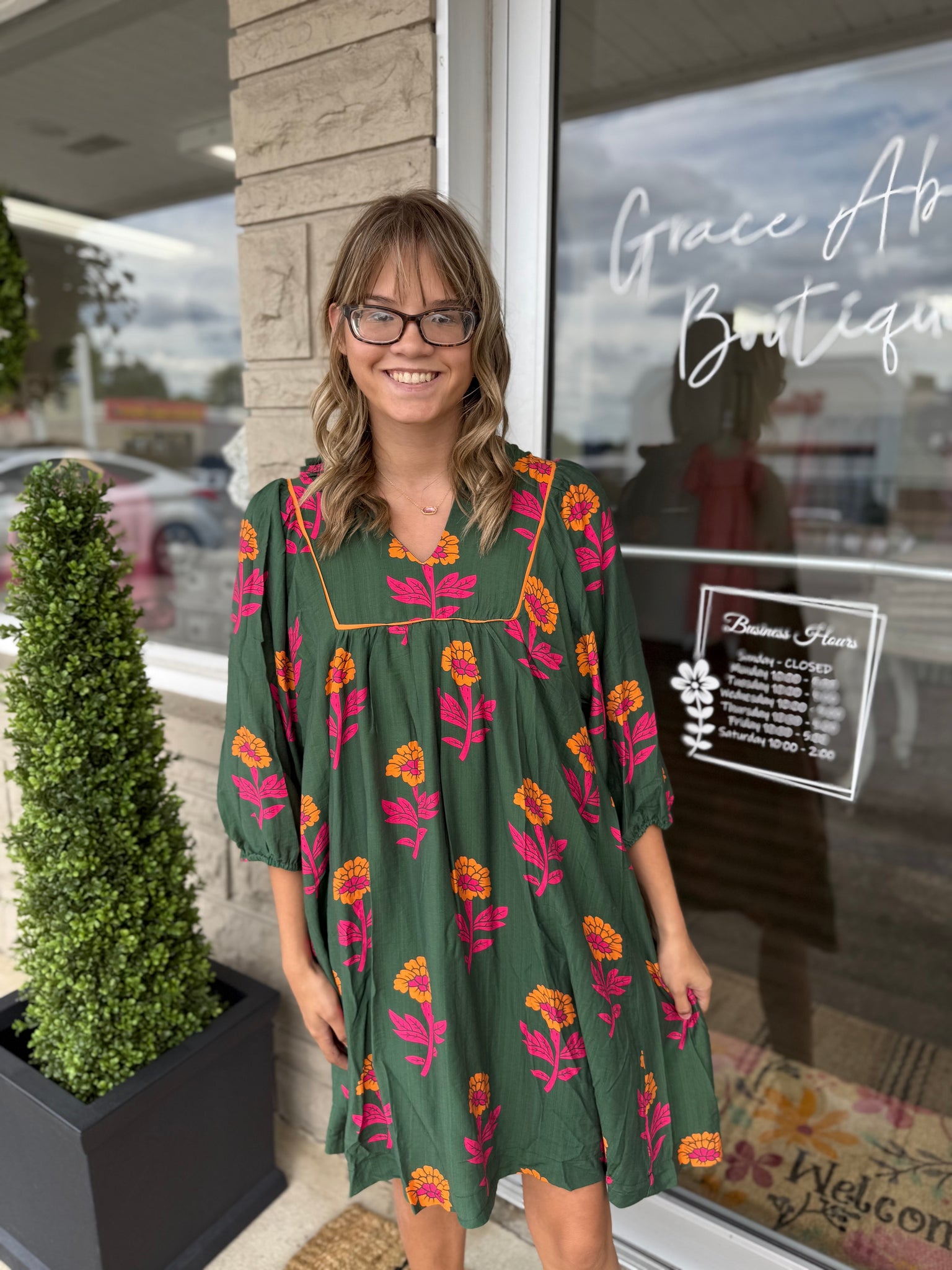 The Maple Dress features a playful floral print that brings a fresh, lively touch to your wardrobe. Designed in a flattering babydoll silhouette, it offers comfortable ease and a youthful vibe. The 3/4 length puff sleeves add a stylish, vintage-inspired detail, while the fully lined construction ensures a smooth fit and comfortable wear throughout the day. Ideal for those seeking a blend of charm and sophistication in one effortless piece. True to size: Anna Claire is wearing a small.
