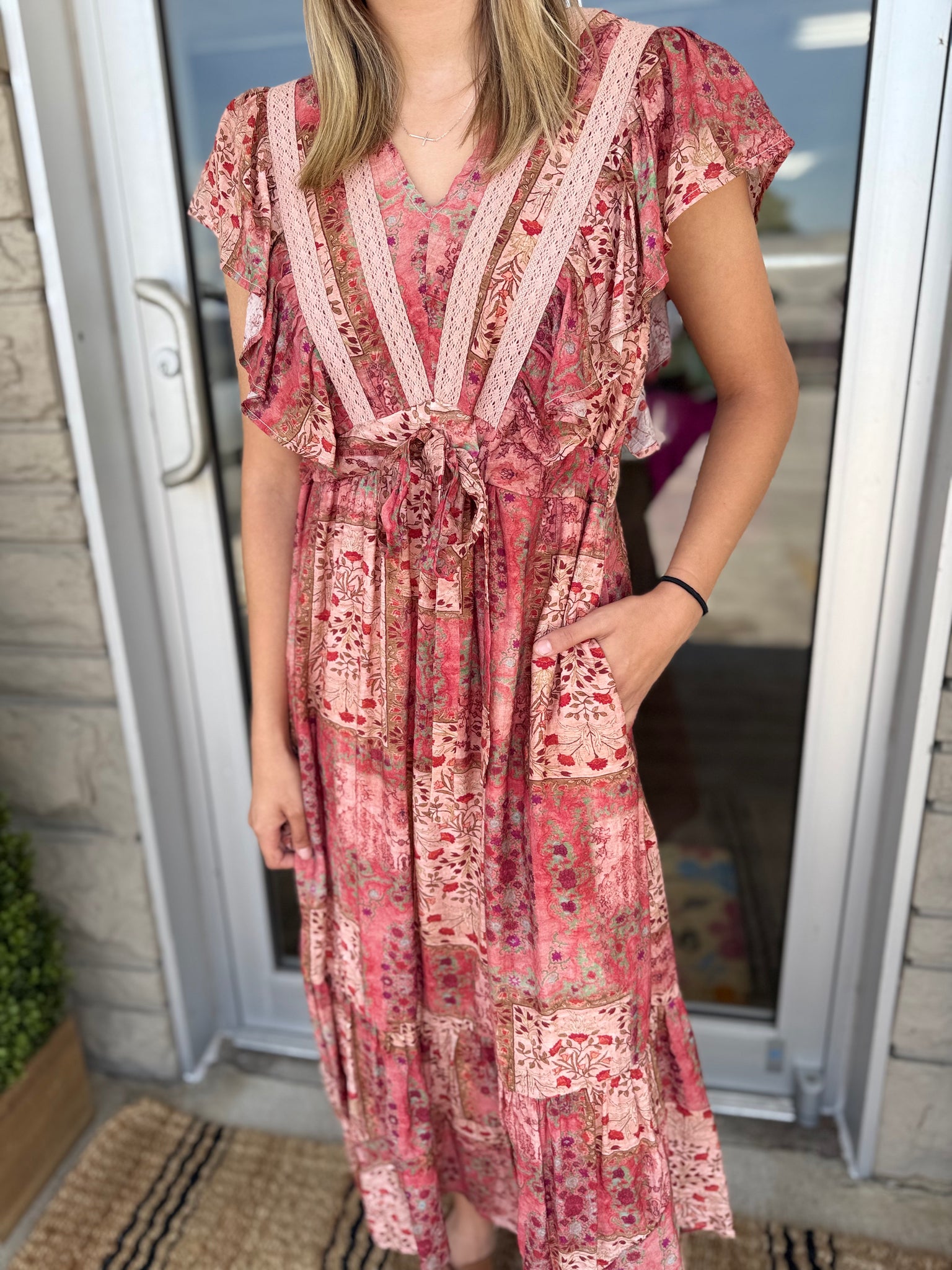 The Meredith Maxi features a flattering v-neckline and is fully lined for comfort and coverage. Designed with practical pockets, this dress combines elegance with functionality, making it an ideal choice for both casual and formal occasions. True to size, Anna Claire is wearing a small! Drawstring waist!