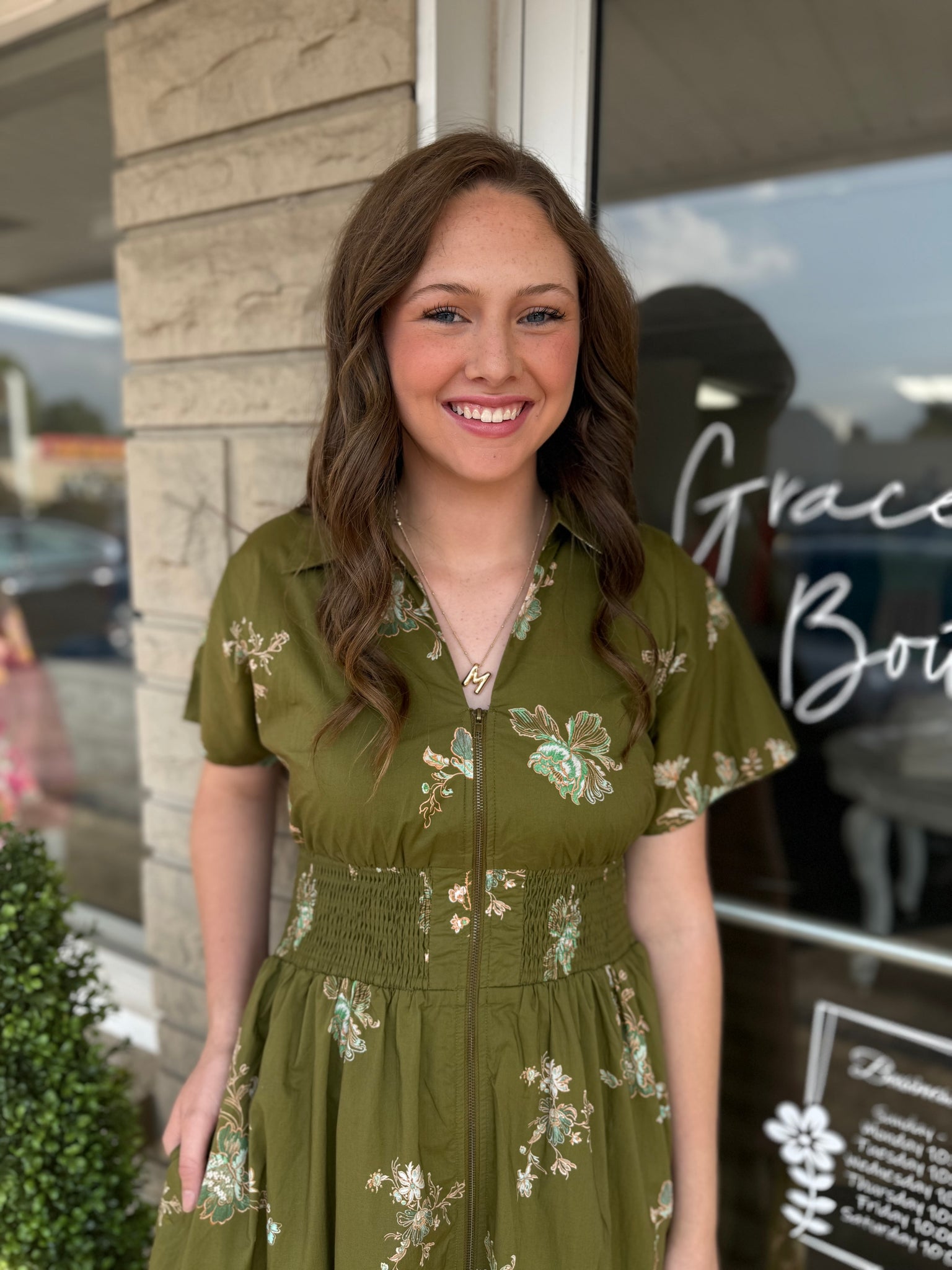 Step into autumn with the Olive Dress, featuring a playful fall floral print that brightens any day. Its maxi length flows elegantly, while the split neckline adds a flirty touch. Short sleeves keep it breezy, and the elastic waistband ensures a comfy fit all day long. A subtle zipper detail adds a fun, modern twist to this effortlessly stylish dress.