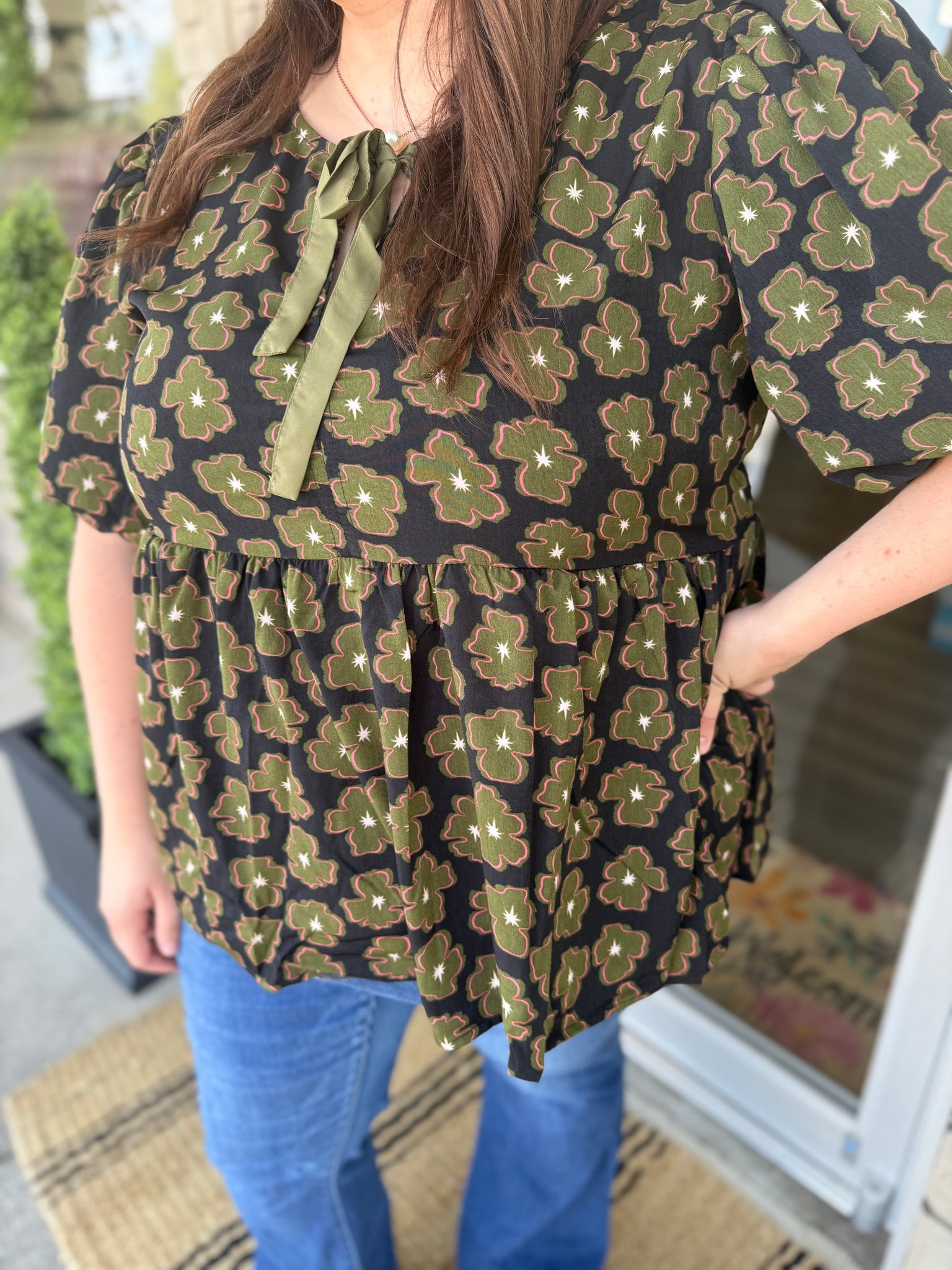 Add a touch of fun to your wardrobe with this playful baby doll top featuring a charming black and olive green print. The short, puff sleeves create a flirty silhouette while the relaxed fit keeps you comfy all day. Perfect for those who love a stylish yet easygoing look. True to size, Laura is wearing a 2XL.