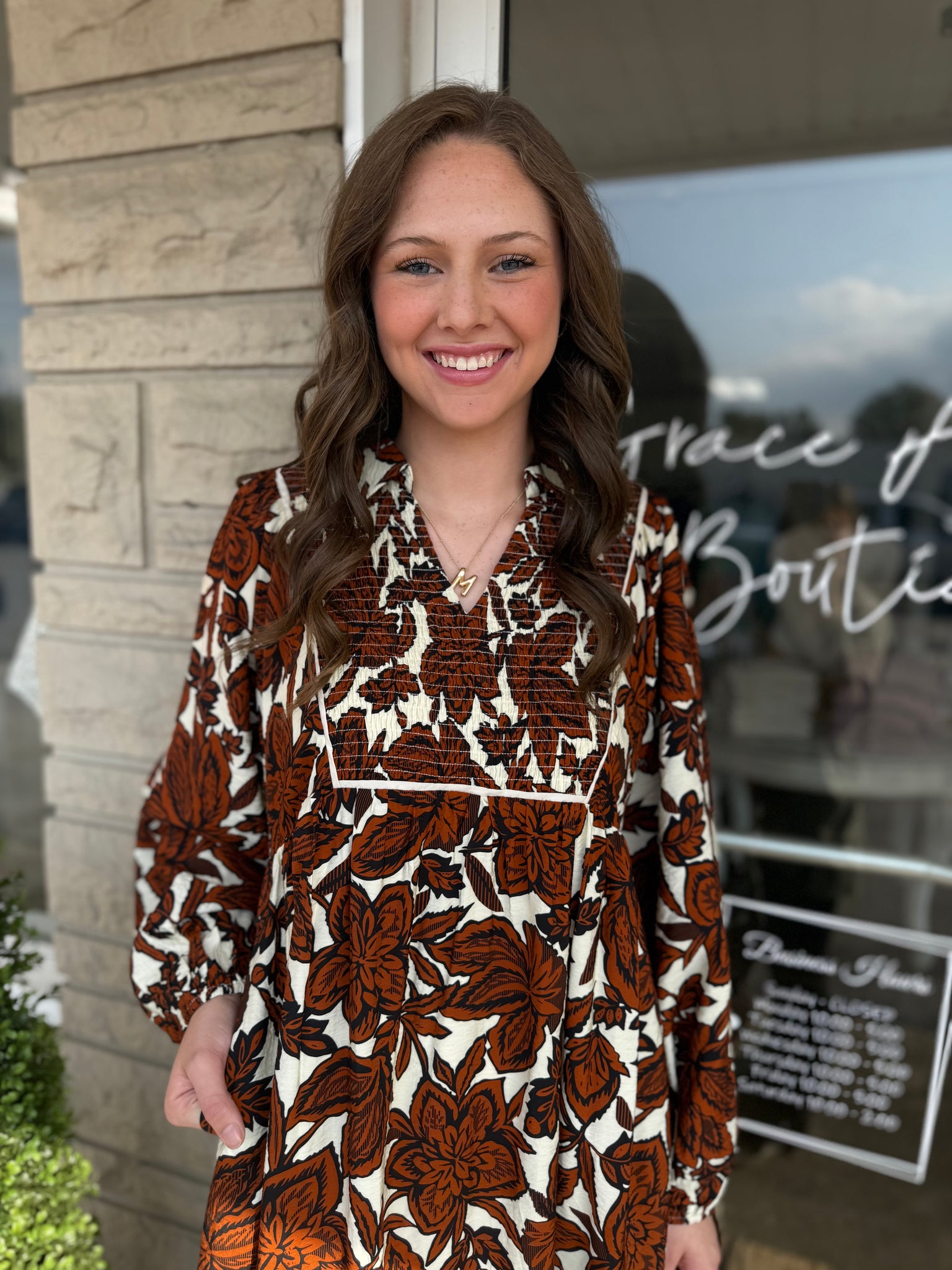 This Rustic Maxi combines effortless style with functionality, featuring a long sleeve design and a versatile split neckline for a flattering fit. Crafted with practical pockets, it’s perfect for carrying essentials on the go. Adorned with a playful fall floral print, this maxi brings a touch of seasonal charm to your wardrobe while ensuring comfort and ease throughout the day. True to size, Natulie is wearing a medium.