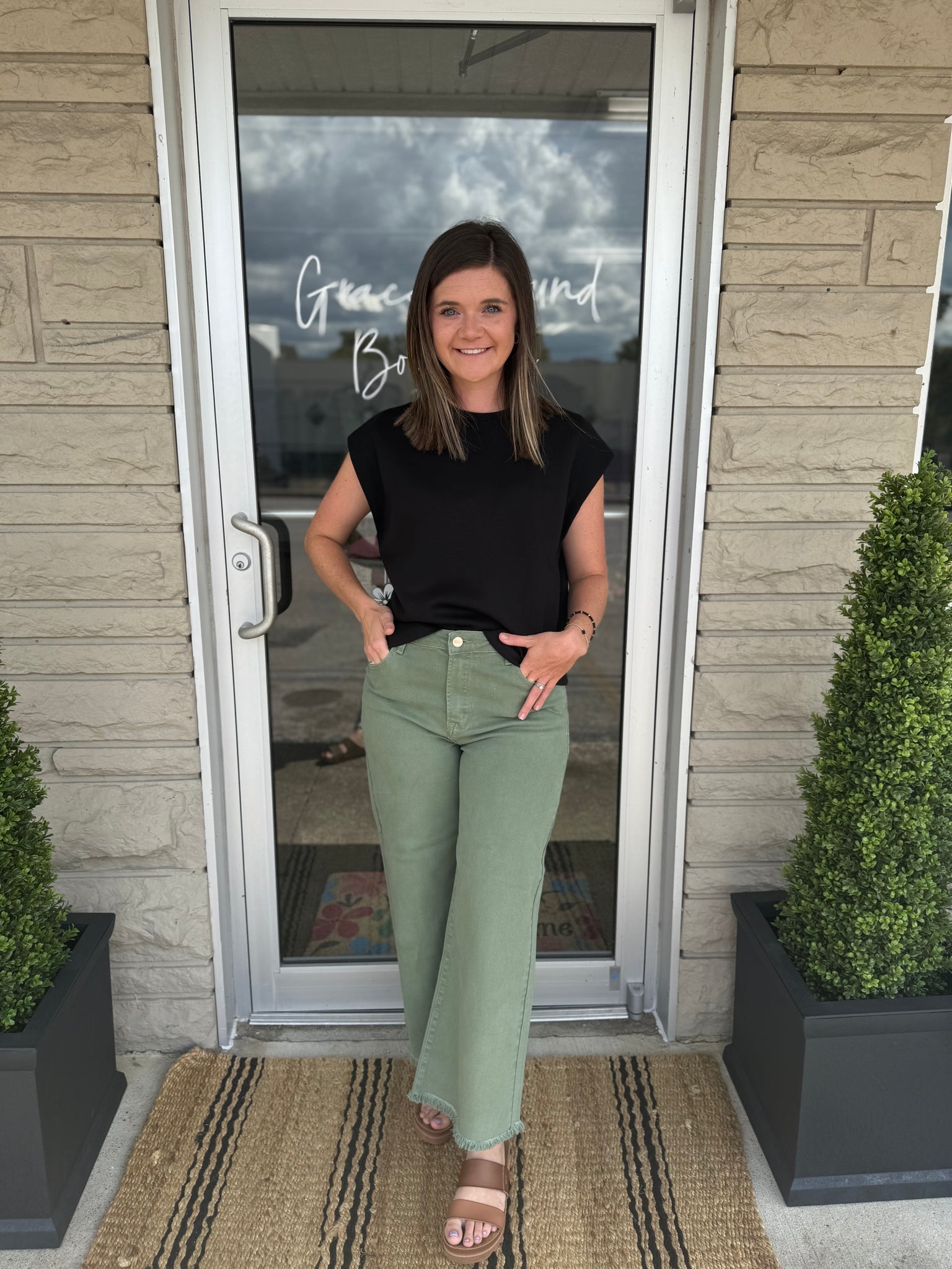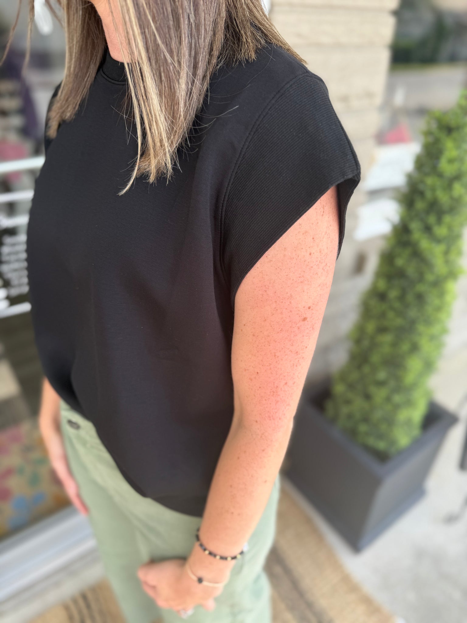 This Transition Top features cap sleeves and is crafted from a super soft, lightweight fabric that offers comfort without being sheer. Its sleek black color makes it a versatile addition to any wardrobe, perfect for layering or wearing on its own with confidence. True to size, Haley is wearing a medium.