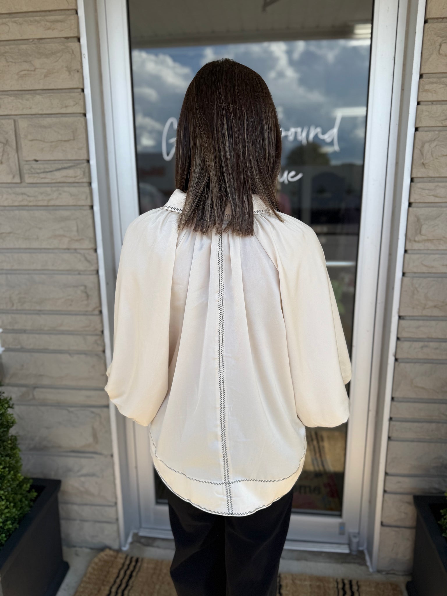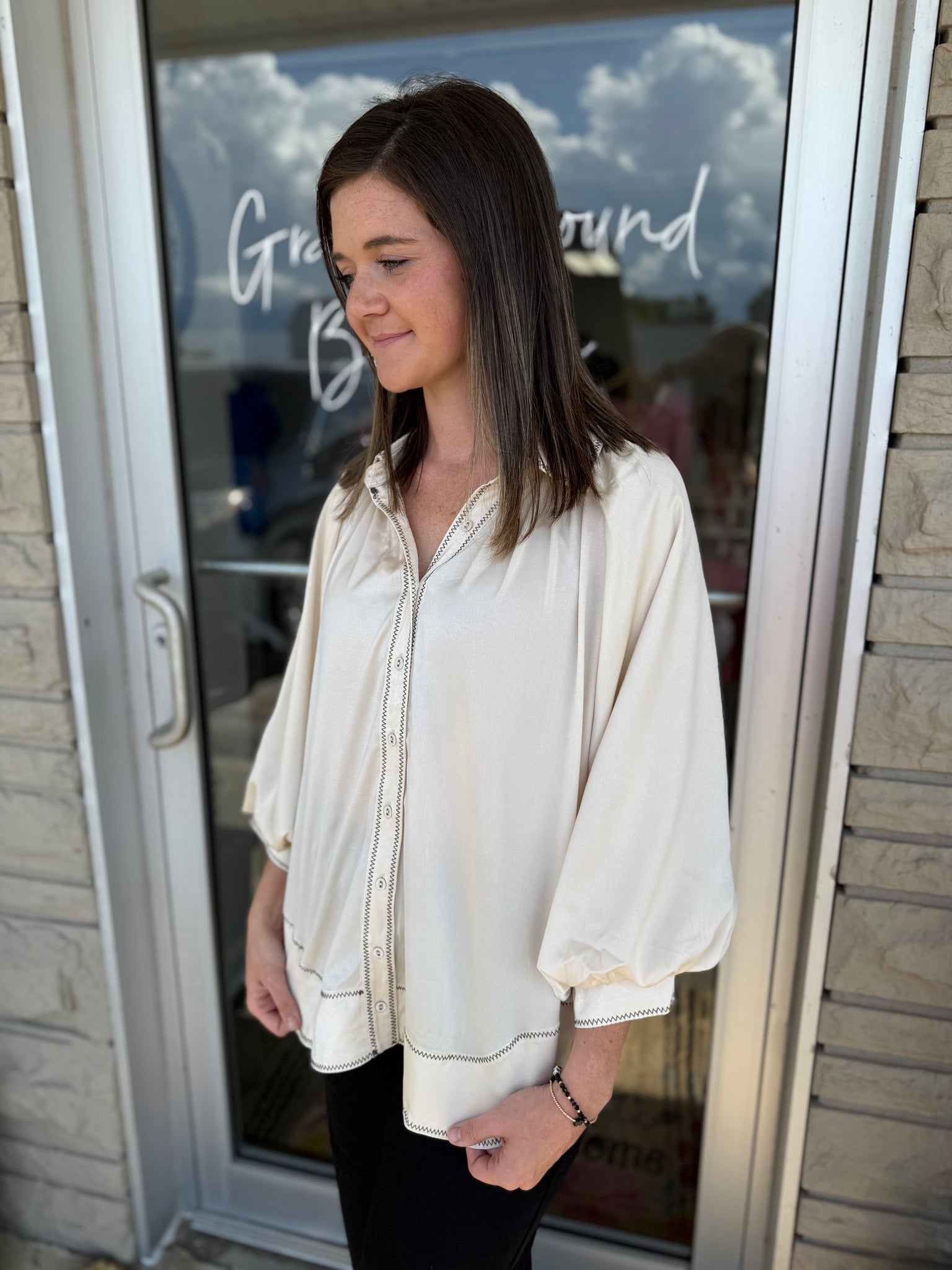 This Western Top features a luxurious satin fabric that offers a smooth, elegant feel. Its balloon sleeves add volume and a modern silhouette, while the button-down front provides classic versatility. The wavy hem enhances movement and visual interest, complemented by precise stitching details that highlight craftsmanship. Perfect for those seeking a refined yet distinctive blouse with expert design elements. True to size, Haley is wearing a medium.